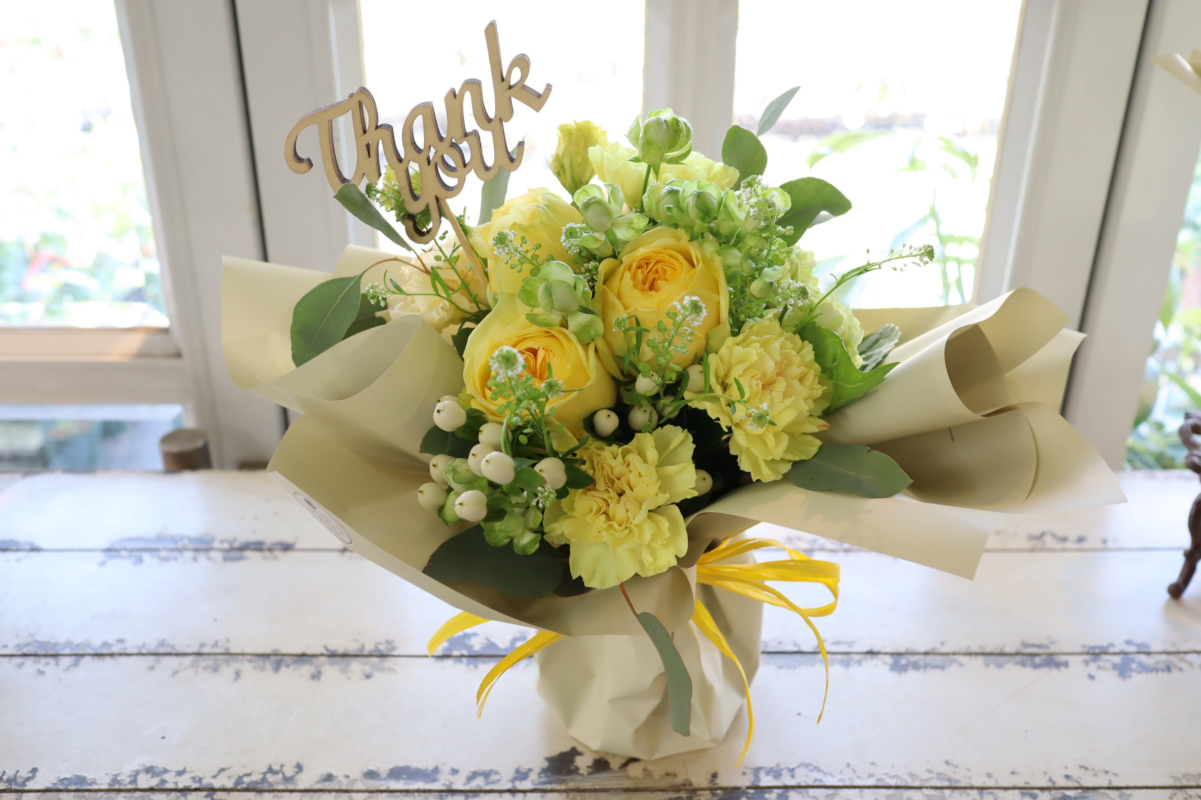 花瓶がなくてもそのまま飾れる立つブーケです。